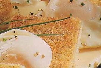 - Garnissez le fond d’un plat de service creux avec la purée Soubise, posez dessus les tranches de pain frites, disposez un œuf sur chaque tranche.