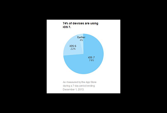 Apple vient de publier sur son site web pour les développeurs un nouveau tableau qui montre que l’iOS 7 est désormais présent sur 74% des appareils utilisant iOS. Cela signifie que l’adoption du système d’exploitation a augmenté de 10% depuis les derniers chiffres publiés en octobre. Par ailleurs, ces données coïncident avec l’étude rendue publique plus tôt dans la semaine par Chitika (lire iOS 7 : déjà présent sur 70% des appareils Apple).