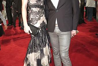 La comédienne Sonia Okacha dans une robe sirène en tulle nude appliqué de dentelle noire du créateur Christophe Guillarmé qui l'accompagnait pour l'occasion