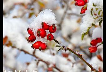 L'églantine est la princesse des buissons et des haies. Cette rose sauvage est encore plus belle lorsque elle offre ses joyaux carmins à la neige fraîchement tombée...