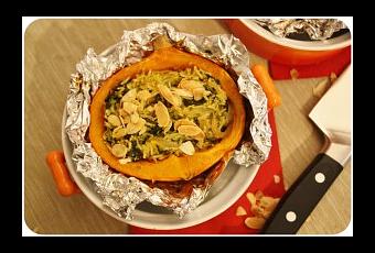 C’est la pleine saison des courges, potirons et autres butternuts… je vous livre aujourd’hui une recette automnale (on ne dirait pas mais si si, on est pas encore en hiver !) et très simple à réaliser, qui change un peu des soupes… un potimarron farci au riz Tilda et épinards, à l’indienne donc !