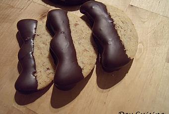 - Quand les biscuits sont complètement refroidis (on peut faire ça le lendemain), faire fondre du chocolat au bain marie et y tremper la moitié des croissants (ici soir en hauteur soit en longueur) dans le chocolat fondu et laisser prendre sur une grille.