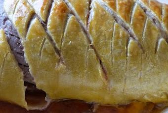 Lorsque le filet est complètement froid, coupez le au milieu et farcissez-le de tranches de foie gras. Refermez le filet. Étalez la pâte feuilletée, placez-y la viande et entourez la de la pâte. Fermez bien et dorer le au pinceau avec le jaune d’œuf.