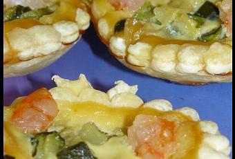 Dans chaque tartelette, déposer de la courgette, des crevettes et recouvrir avec la préparation.