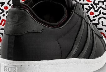 Les sneakers ont un dessus en cuir et ripstop noir avec le logo de Run DMC sur la semelle intérieure et l’artwork d’Haring sur le tag de la languette.