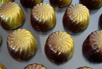 Ils sont fourrés d'une pâte à tartiner aux noisettes à l'ancienne et d'une noisette entière. Les coques en chocolat noir sont décorées au airbrush avec du beurre de cacao doré. Des petits bijoux à offrir en cadeau à mes amis gourmands.