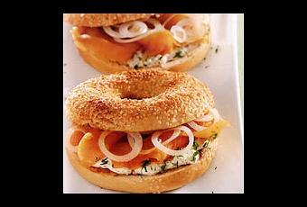 - Tartiner de fromage frais une moitié de bagel et la garnir de 2 tranches de saumon. Éplucher l'oignon, l'émincer finement et ajouter quelques rondelles sur le saumon, Faire un sandwich en couvrant avec l'autre moitié de bagel Procéder de la même manière avec les autres bagels.