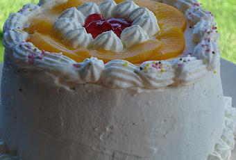 Génoise aux amandesCrème à la vanilleGelée de groseilles et compote de pêches gélifiéeGlaçage chantilly mascarpone