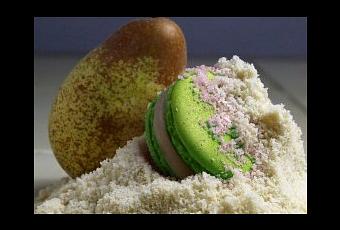 Un surprenant macaron, avec une garniture dont la texture ressemblerait presque à une ganache. Un mélange très simple fait de poire et de poudre d’amande.