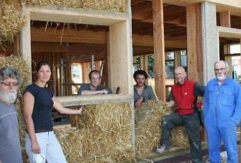 Chantier ouvert pour la construction en bottes de pailles de la maison d’accueil des jeunes enfants à St Meen Le Grand. Photo Ouest France