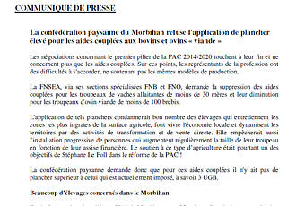 Au moment où se discute l'application française de la PAC, je vous fais part de mon opposition aux mesures préconisées par la FNSEA via ses sections spécialisées (FNB, FNO) pour supprimer les aides couplées aux troupeaux de moins de 30 vaches mères, les diminuer pour les troupeaux de moins de 100 brebis, ainsi qu'aux éleveurs n'atteignant pas un ratio élevé de productivité, et la suppression des 40 % de génisses dans le calcul. Je suis consterné de voir une partie de la profession vouloir éliminer les petits et moyens éleveurs en les privant de presque la moitié de leur revenu, ceux là même qui font vivre l'économie locale (abattoir, atelier de découpe, atelier de transformation) et dynamisent les territoires.