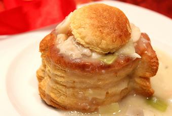 Réchauffez les croûtes de vol-au-vent au four pendant quelques minutes. Versez la sauce sur les croûtes de vol-au-vent bien chaudes et servez.