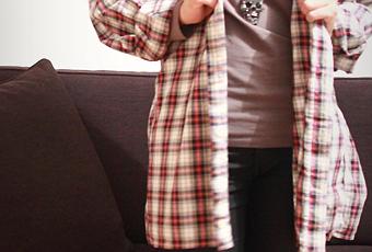 A force de voir des carreaux partout (influençable que je suis), j’ai voulu tenter un look à carreaux. N’ayant pas ce qu’il faut dans mon dressing, j’ai piqué dans l’armoire d’à côté. Vous aurez remarqué, j’ai un dressing et lui une armoire… No comment…