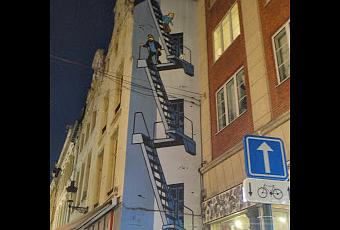 les belges aiment les moules et pis les frites, la bière, rigoler, et la bande dessinée. ce sont certes des clichés, mais dans tout cliché il y a un fond de vrai... en tous cas les murs de belgique ne sont pas tous pelés ou gris... la preuve en images : le capitaine haddock à la manoeuvre trompe l'oeil le marsupilami échiquier de façade