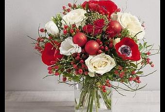 Un beau bouquet rond rouge et blanc avec des boules de Noël . Il sera livré dans son vase Carédo.