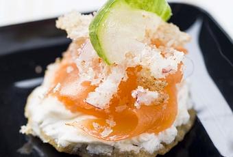 Première idée, assez simple, une petite galette ronde plate, du fromage frais (genre saint Morêt), un bout de saumon fumé (ou truite d’ailleurs), un peu de biscuit écrasé (n’importe lequel, celui que tu as sous la main) et pour faire joli un petit bout de concombre (avec la peau) en « fleur » sur le dessus.
