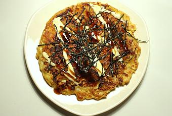Cette galette au chou japonaise peut être accommodée avec d'autres ingrédients comme de la bonite séchée, des crevettes...