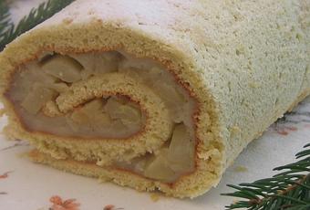 Dérouler le biscuit, étaler la crème pâtissière-poires, et rouler délicatement.