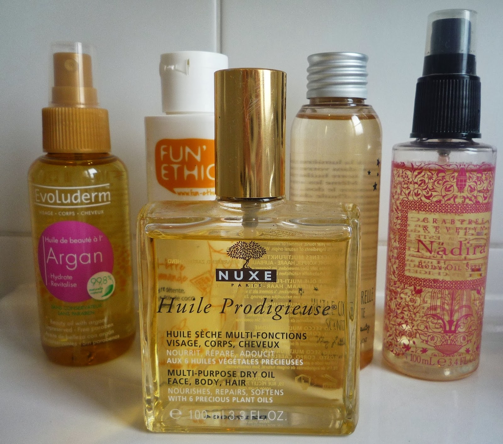 Pendant longtemps, j'ai boudé les huiles...J'avais un peu peur que ce soit trop gras, que ça tache mes vêtements et depuis quelques mois, je m'y suis mise (surtout l'été) et je suis fan! Souvent, je me sers de mes huiles pour me parfumer délicatement. C'est une bonne alternative aux parfums qui ont tendance à me donner mal à la tête. J'ai également un vrai coup de cœur pour l'huile pour le bain de Jo Malone: j'en mets quelques gouttes dans un bon bain chaud et elle donne une texture un peu lactée à l'eau qui laisse la peau douce et très agréablement parfumée.Huile à l'argan Evoluderm, Huile Prodigieuse Nuxe, Huile Fun'Ethic, Huile My Little Beauty, Huile Crabtree & Evelyn
