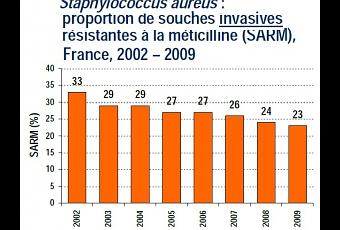 Staphylococcus aureus provoque plusieurs types d’infections, du furoncle et de l’infection cutanée aux pneumonies mortelles et à la septicémie. Aux seuls Etats-Unis, 70.000 Américains développent une pneumonie à staphylocoques chaque année, dont à SARM. En France, Staphylococcus aureus représente près de 20% des infections nosocomiales et 52% des infections à Staphylococcus aureus sont résistantes à la méticilline. Si cette proportion de SARM tend à baisser (Voir schéma ci-contre), ce toujours près de 10.000 cas en établissements de Santé qui sont recensés chaque année en France. C’est sans compter le développement des infections à en milieu communautaire, qui sont estimées, toujours en France, à plus de 30.000 cas dont plus de 7.000 cas à Sarm, chaque année.