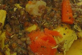 900 g de blancs de poulet-200 g de lentilles -1gros oignon -3gousses d'ail -5 échalotes -3 carottes-3 navets -8 brins de coriandre-25 cl de bouillon de volaille -1cuil.è café de garam masala-90 g de beurre-1cuil. è café de curcuma - 1cuil.è café de coriandre moulue -1cuil.è café de cardamome moulue-1cuil. à s.de gingembre haché- 1/2 cuil. à café de piment de Cayenne.