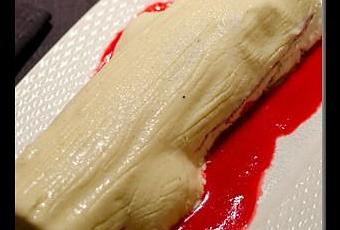 Au moment de servir, rainurer la bûche à l’aide d’une fourchette pour un effet ‘bois’! Saupoudrer la bûche et le plat de service de sucre glace. Décorer de coulis de fruits rouges (simplement mixés avec le sirop de sucre).