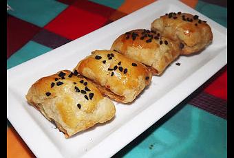 300g de viande de poulet ou de dindeUn demi oignonUne petite carotte2 gousses d'ail50g d'olives dénoyautées2 cs de crème fraîche2 portions de kiri( ou autre fromage cuit)1 œuf ( blanc pour la farce jaune pour la dorure)1 cs de câpres (facultatif) sel poivre muscadegraines de nigelles et de sésames pour la décoRECETTEmettre les éléments de la farce dans un hachoir et mixer jusqu’à l'obtention d'une pâte de volaille qui se maintient. Si elle colle trop, rajouter une peu de chapelure pour absorber le surplus de liquide. Sur un plan de travail, étaler la pâte feuilleté si elle ne l'ai pas déjà. prendre la moitié de la pâte de volaille et placer sur la pâte en formant un boudin. rouler pour enfermer la farce dans la pâte. faire de même avec le reste de la mixture volaille.