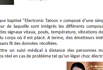 Un pas est sans doute franchi avec les travaux de la chercheuse chinoise Nanshu Lu, qui a présenté lors du dernier forum NetExplo, un tatouage électronique permettant de capter la plupart des signaux vitaux, pouls, température, vibrations des cordes vocales, suivant l’endroit du corps où il est placé. Il a été baptisé "Electronic Tatoos".