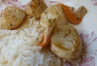 Faire mousser une noix de beurre dans une poêle et y faire sauter pas plus de 3 minutes les St-Jacques - en tout - , les parties corail en dernières secondes. Servir avec une giclée de jus de citron, accompagner de riz cuit à la créole. Tout simple ...