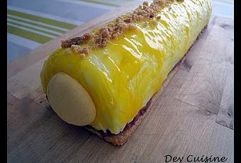 Déco : nappage + colorant jaune + brisures de biscuit breton + 2 macarons pour les extrémités