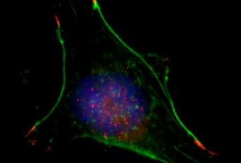 Bas : « Cellule de cancer du sein dans des conditions de faible niveau d’oxygène : les cellules forment des structures qui facilitent le mouvement, comportant des filaments qui permettent à la cellule de se contracter (vert) et de s’étirer en long (rouge) ».