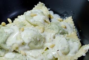 Egoutter et servir les ravioles avec un trait de crème, du fromage truffé râpé et quelques pignons.