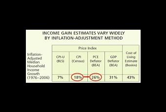 Le premier élément à rectifier est le choix de l’indicateur à utiliser pour estimer l’inflation. Les statistiques du Census utilisent le « Consumer Price Index » (CPI). Mais des recherches approfondies[5. Pour plus de détails voir par exemple Michael J. Boskin, 2005, “Causes and Consequences of Bias in the Consumer Price Index as a Measure of the Cost of Living,” Atlantic Economic Journal 33:1–13 ; et Michael J. Boskin, January 2008, “Better Living through Economics : Consumer Price Indexes,” présenté à l’American Economics Association Annual Meetings.] ont montré que cet indicateur surévalue largement l’inflation, la preuve en étant que la grande majorité des économistes et la Fed [6. Réserve Fédérale, banque centrale des États-Unis.] elle-même utilisent plutôt le « Personnal Consumption Expenditures deflator » (PCE), publié par le Bureau d’Analyses Économiques américain[7. Autre agence gouvernementale, qui dépend aussi du Département du Commerce des États-Unis.]. Or, si l’on prend cet indicateur, l’évolution du revenu médian n’est pas de +18% mais de +26%.