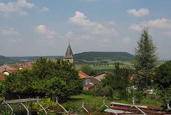 Nous voici au milieu de prés pentus où la progression, sur une glaise desséchée où se sont fossilisées les empreintes profondes des sabots d'un troupeau de vaches, est particulièrement malaisée. Je n'ose imaginer ce qu'il en serait s'il avait plu. Un repère géodésique côté 378, est planté au beau milieu du pré, sans autre motif apparent que le hasard de la toise d'un géomètre fatigué qui aurait décidé de faire sa mesure à cet endroit précis, plutôt qu'à un autre plus stratégique, au sommet du Mont, par exemple, culminant juste au-dessus de nous à 427 mètres ! Effectivement, le paysage magnifique offre une vue panoramique sur la plaine et sa beauté peut à elle seule justifier le choix du topographe. Plus loin, à l'ombre, en lisère de forêt, quelques génisses, nous regardent approcher, surveillées par un énorme taureau brun. Par prudence, nous franchissons la clôture et arrivons au village voisin par les bois. Le sentier se fait chemin quand à la forêt succèdent des vergers, puis des jardins. Mont-l’Étroit, exposé plein sud, baigne dans une lumière éclatante. Tout en haut du village, sa jolie petite église au clocher trapu surveille les vieilles tombes d'un paisible cimetière, telle une poule au milieu de ses poussins. Mais pas de coq au sommet du clocher pour ma collection ! À la place, une modeste et rudimentaire croix de fer. Nous descendons la rue, admirant au passage un calvaire orné d'une tête de mort, ressemblant à celui de Saulxures comme un frère. Un ancien lavoir, des maisons paysannes au style préservé, un moulin à huile désaffecté, utilisé pour entreposer des ustensiles et des bidons d'une huile peu appétissante destinés à la mécanique agricole, retiennent notre attention et motivent les explications de nos amis.