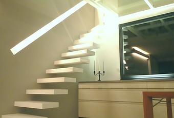 Accompagné de cette logique, une architecture de métal peut se transformer en mezzanine design, arborant un escalier suspendu en verre. Le limon soutenant et soulignant l’alignement des marches flottantes, transparentes, et la nuit venue, luminescentes.