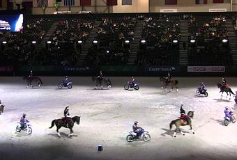 Le samedi 14 décembre 2013, cavaliers et motocyclistes de la garde républicaine présentent au public leur carrousel mixte dans le cadre du 53ème concours hippique international de Genève (Suisse) qui se déroule du 12 au 15 décembre 2013.