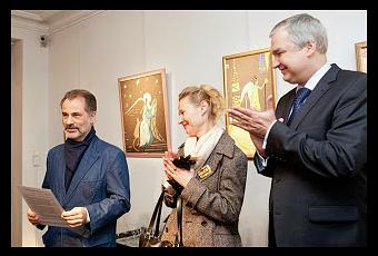 En ce mois de décembre ont eu lieu, à Paris, deux vernissages d'expositions d'Irina Kotova. Le premier le 10 décembre, dans la galerie d'Orthodoxie.com, pour l'exposition "De l'Incarnation à la Résurrection". Deux reportages de la télévision orthodoxe russe Soyouz en rendent compte: le premier, le second (sur Youtube). Le deuxième vernissage s'est déroulé dans la galerie Russkiy Mir, le 19 décembre, pour l'exposition "Les ailes de Noël" qui comprend également des œuvres - de la mosaïque textile - de Margarita Kotova, mère d'Irina Kotova. Un reportage photographique vient d'être ajouté sur la page Facebook de la galerie Russkiy Mir. Dans les deux vernissages, j'ai présenté l'exposition avant de donner la parole à d'autres intervenants. Sur la photographie ci-contre, dans la galerie Russkiy Mir, lors de la présentation, je suis aux côtés d'Ilona Yurevich, conseillère à l'ambassade de Biélorussie à Paris, chargée de la coopération avec l'Unesco, et de l'ambassadeur, Pavel Latushka (qui se prononce Latushko), auparavant ministre de la Culture de la République du Bélarus, qui a présidé ce vernissage.