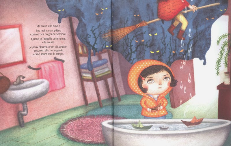 Pas simple d’avoir une grande sœur qui bave comme un crapaud et a ses mains « pliées comme des doigts de sorcière ». Une grande sœur qui vous « regarde avec ses grands yeux sans rien dire, ni rien faire » et qui sourit tout le temps. Une grande sœur à laquelle on ne peut confier aucun secret et qui focalise constamment l’attention des parents. Toujours elle qui est collée contre maman ou papa, toujours elle à qui on fait bien attention.Du coup la cadette la déteste, elle pense que « la vie serait bien plus agréable si elle n’avait jamais été là. » Elle se confie à sa grand-mère. Cette dernière ne la gronde pas, elle lui dit juste de penser aux bons moments qu’elles passent ensemble. Parfois dans la rue les regards se posent sur l’ainée, comme si elle n’était qu’une bête curieuse et il faut alors la protéger. Et quand maman leur lit une histoire « je faufile ma main entre les doigts tordus de ma grande sœur. Le monde peut bien s’effondrer, rien ne peut nous atteindre. J’oublie tout ce que je déteste tellement en elle. Il suffit qu’elle soit là avec moi. »