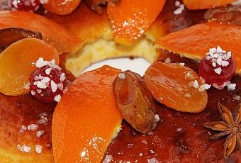 - Débarrasser sur la grille pour arrêter la cuisson. Napper de confiture d'abricot et décorer de fruits confits, d’anis étoile et de quartiers d'orange confies.