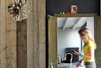 J'aime tout particulièrement les portes du placard de la cuisine réalisées avec de vielles planches. Tout comme j'aime les tours des portes et les vieilles portes en bois non repeintes. Le mur en brique (ancien) et l'immense mur ardoise (contemporain) subliment le tout.Et pour terminer j'ai un coup de coeur pour la boule en plumes dans la cuisine, je ne sais pas si c'est une réalisation personnelle mais cela me donne des idées !