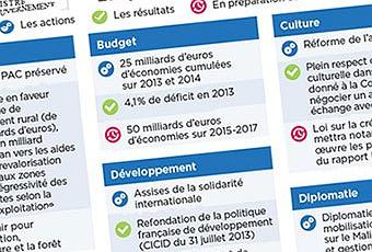 • Loi d’avenir pour l’alimentation, l’agriculture et la forêt • Loi sur la création qui mettra notamment en œuvre les préconisations du rapport Lescure • Loi d’orientation et de programmation sur le développement et la solidarité internationale • Assises de la fiscalité des entreprises dans le cadre de la remise à plat de la fiscalité • Réforme des programmes, redéfinition des métiers et réforme de l’éducation prioritaire • Montée en puissance des contrats de génération, 100 000 formations prioritaires vers l’emploi • Loi sur la transition énergétique • Loi sur la biodiversité et réforme du code minier • Réforme de l’asile • Réforme pénale, réforme de l’ordonnance de 1945 sur les mineurs • Loi sur l’emploi et la compétitivité • Garantie universelle et encadrement des loyers (Loi Alure) • Loi d’adaptation de la société au vieillissement • Loi relative à la formation professionnelle et au dialogue social • Stratégie nationale de santé • Réforme ferroviaire…