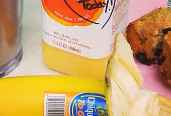 Petit dej : Blueberry oatmeal, Latte from my Verismo coffee machine, Banana, Evolution Fresh OJ
