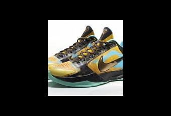 La Nike Kobe V Prelude célèbre le titre de champion NBA de 2011 de Kobe Bryant avec les Lakers ainsi que son titre de MVP. Inspiré du pop art, le dessus a une base jaune avec des accents de bleu et de noir, complété par un swoosh doré et une semelle extérieure glow in the dark.