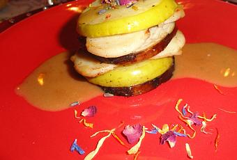 1 pomme granny smith ; 1 boudin blanc ; Andouille véritable de Guéménée ; 1 cs de beurre salé ; 2 cs de beurre ; fond de volaille ; 3 cs de Calvados ; poivre blanc ; fleurs déco