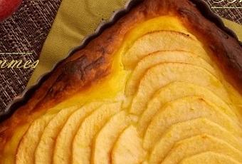 6. Verser la crème patissière. Disposer les pommes épluchées et coupées finement en lamelle. Parsemer de petits morcaux de beurre.