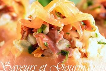 INGRÉDIENTS :P/6 pers12 petites pommes de terre Roseval4 tomates confites à l’huile d’olive6 tranches de saumon fumé2 échalotes émincées3 cuillères à soupe de coriandre hachée.Le jus d’1 citron10 cl de crème fraîchePaprikaSelPoivre.