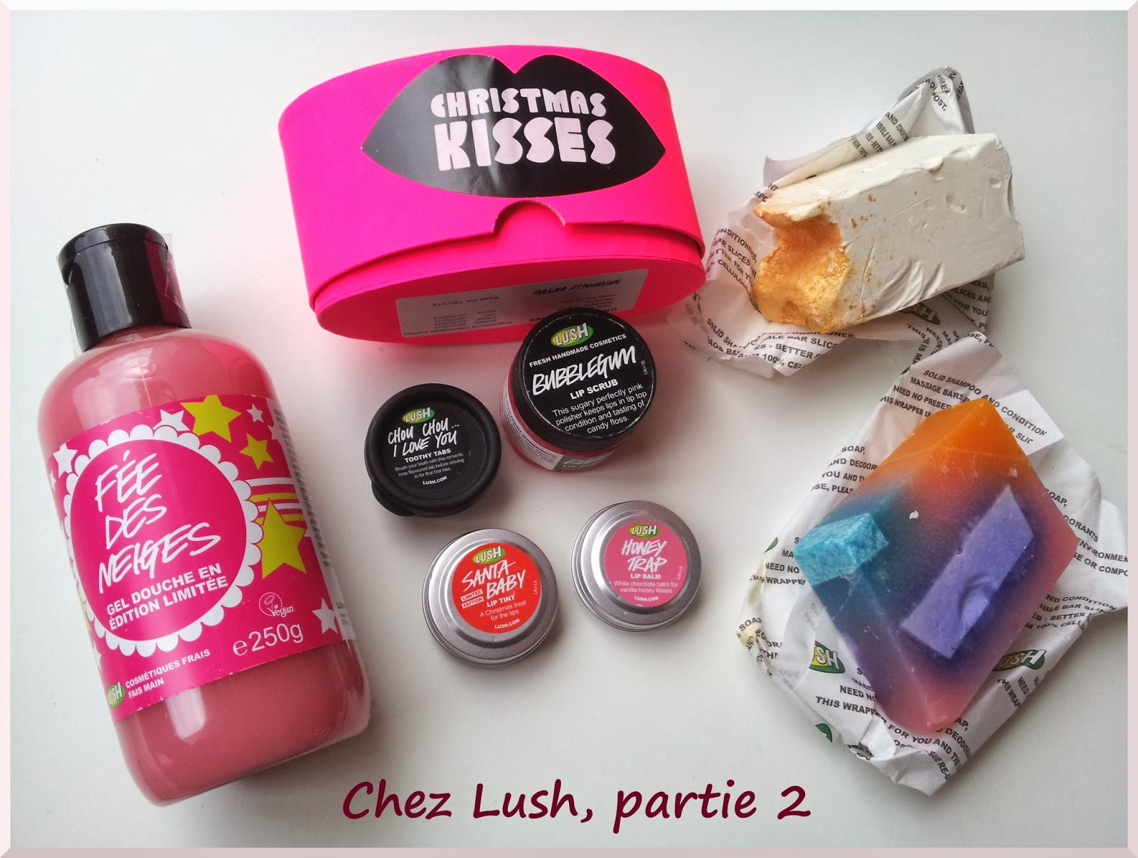 - Après avoir testé un échantillon il y a peu, je n'ai pas pu résister à mettre dans mon panier le fameux Gel douche Fée des Neiges, vous savez celui à l'odeur gourmande de barbe à papa et de bonbon ! Il contient même des micro paillettes, de quoi vous faire briller de mille feux ! - Pour rester dans les produit très "roses", j'ai craqué pour un petit kit pour les lèvres : le Christmas Kisses. Celui ci contient 2 baumes teintés à savoir le baume l'attrape bouche qui est un baume transparent au chocolat blanc, miel et vanille ainsi que le baume Cheery Bibi qui lui est teinté (un rouge cerise) et à l’arôme de cola. L'exfoliant Fée des lèvres au bubble gum ainsi que des pastilles de l'éthifrice Chou Chou (parfumés à la rose) font partie de ce kit. Très girly tout ça n'est-ce pas ?- Pour terminer chez Lush, j'ai craqué pour 2 savons pour le corps. Le premier, Snowcake (en haut) est un joli savon blanc doté de paillettes dorées avec une douce odeur de rose et de pâte d'amande. Le second, Au délice des anges est ce joli savon muticolore qui sent le bonbon et les fruits, j'adore ! J'ai vraiment hâte de tester tout ça !!