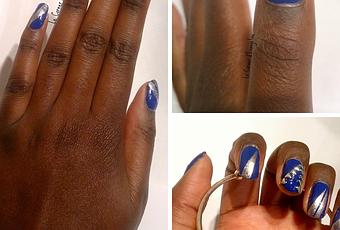 En grosse addict du bleu que je suis, je portais une robe couleur marine avec une encolure brodée de perles argent et bronze. Comme je ne suis pas une blogueuse mode, je vais éviter de vous poster des photos de moi dans des positions douteuses et peu naturelles et me limiter à vous montrer la manucure assortie réalisée pour l'occasion (pudeur oblige !).