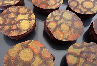 La déco est obtenue avec une feuille transfert faite maison au beurre de cacao coloré.