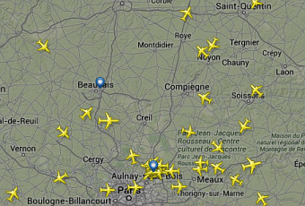 La pépite de la semaine, c’est FlightRadar, déjà rapidement évoqué sur Twitter. Ce site permet de suivre en temps réel (ou en léger différé pour les données de la FAA) tous les vols (ou presque?) sur la planète, y compris les avions au sol. Voici par exemple à quoi ressemble trafic aérien autour de Paris un mercredi matin autour de 9h.